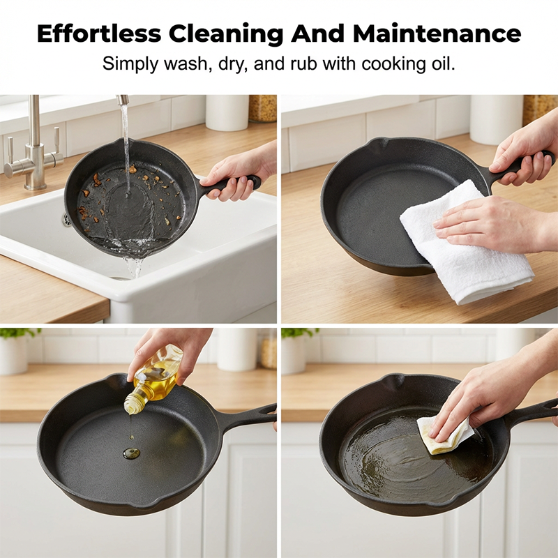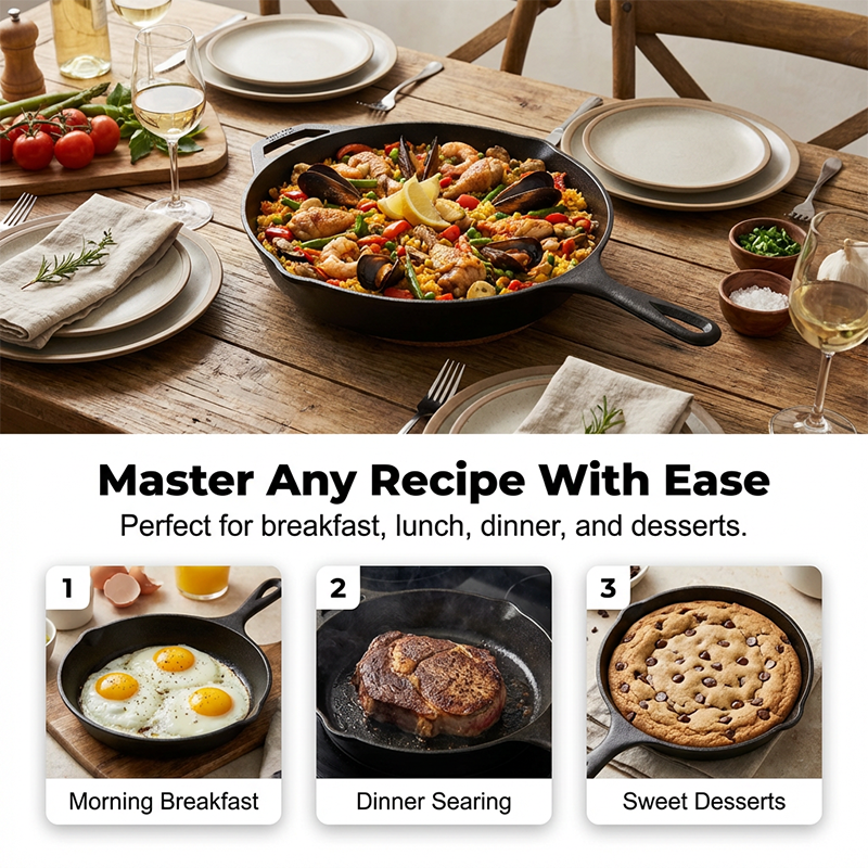 TARTÓS ÖNTÖT VAS KIVITEL – Ez a serpenyő egy életre készült: ellenáll a deformálódásnak, a horpadásoknak és a repedéseknek. Robusztus felépítése biztosítja, hogy bírja a magas hőmérsékletet és az intenzív használatot, így a konyhád megbízható örökös darabjává válik.