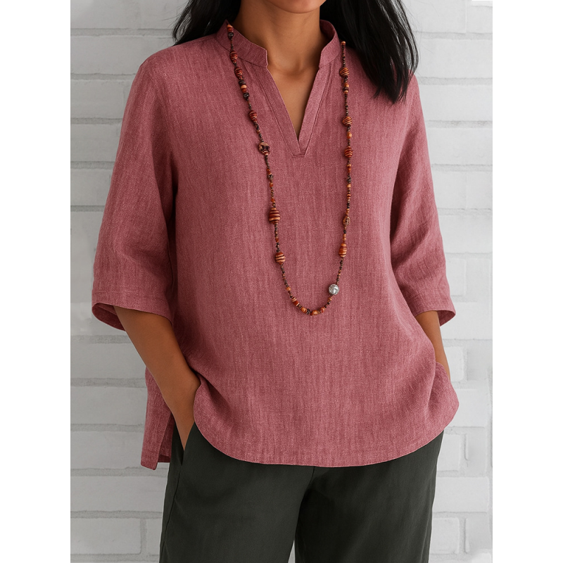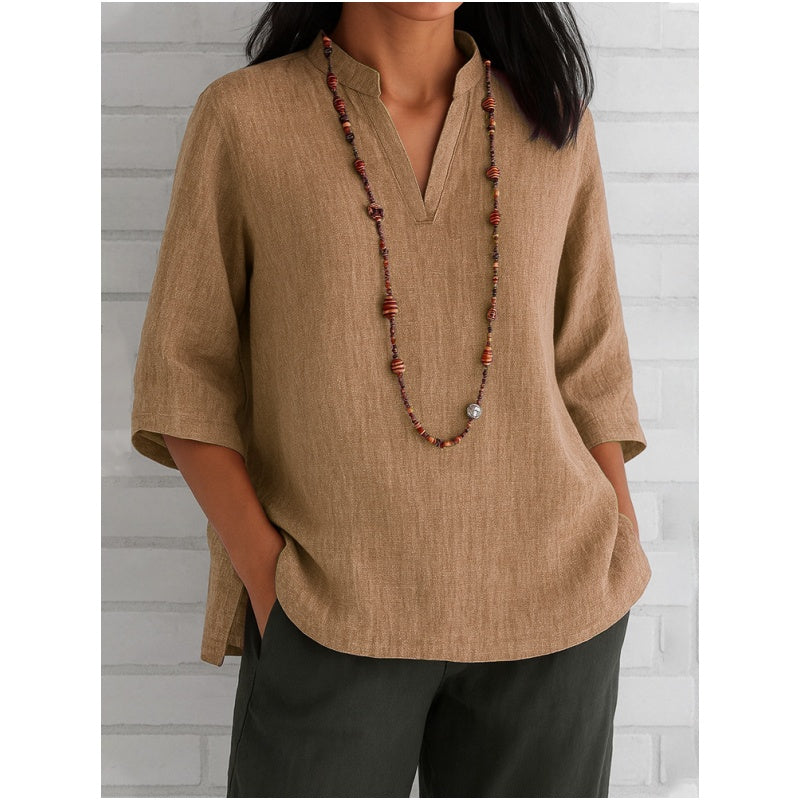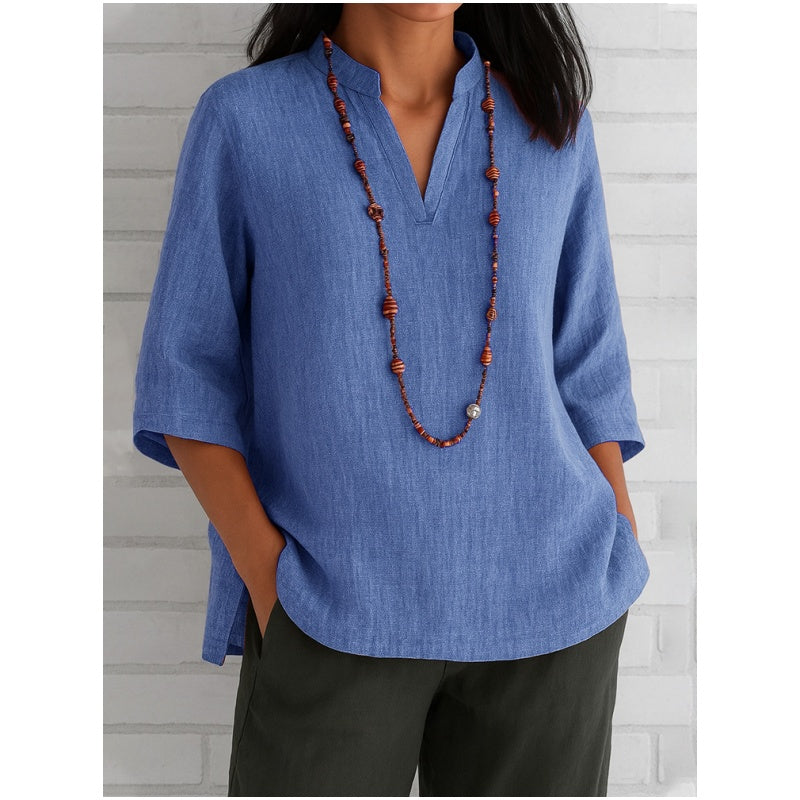 Női V-nyakú, laza fazonú pamut-lenvászon felső